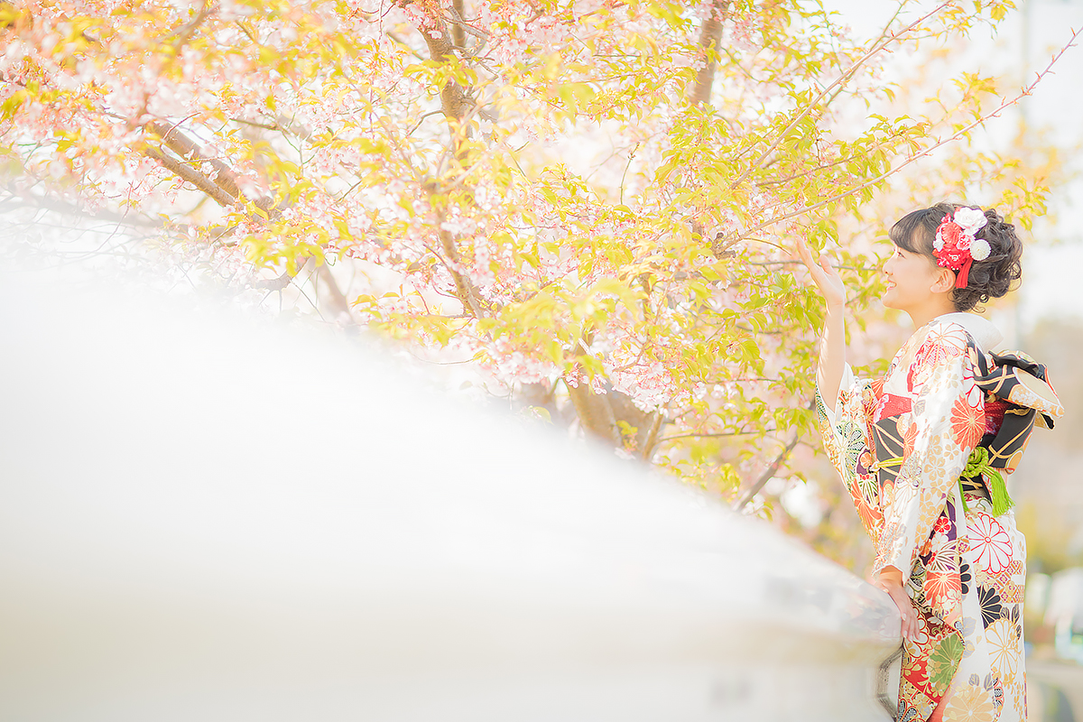 菜の花も咲き、ピンク、緑、黄色の賑やかな色彩と、それに負けない彼女の笑顔が眩しい一枚となりました。