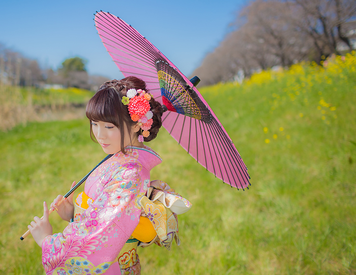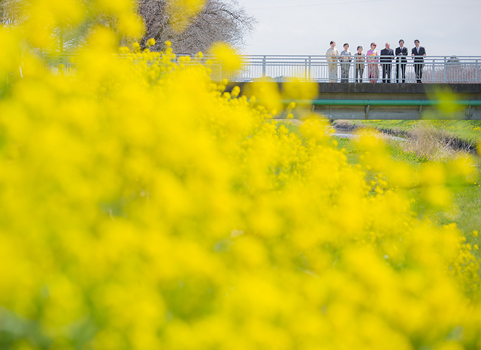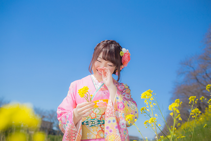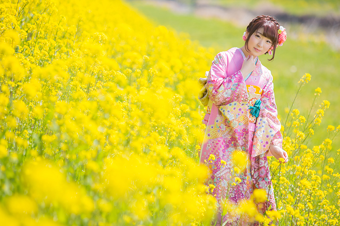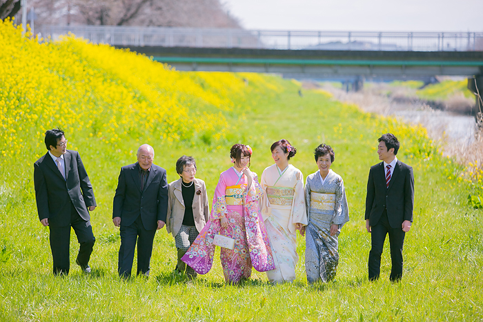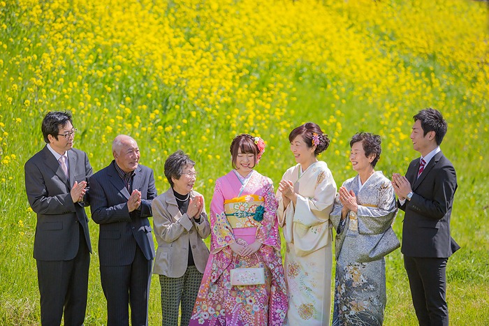 菜の花と振袖と家族